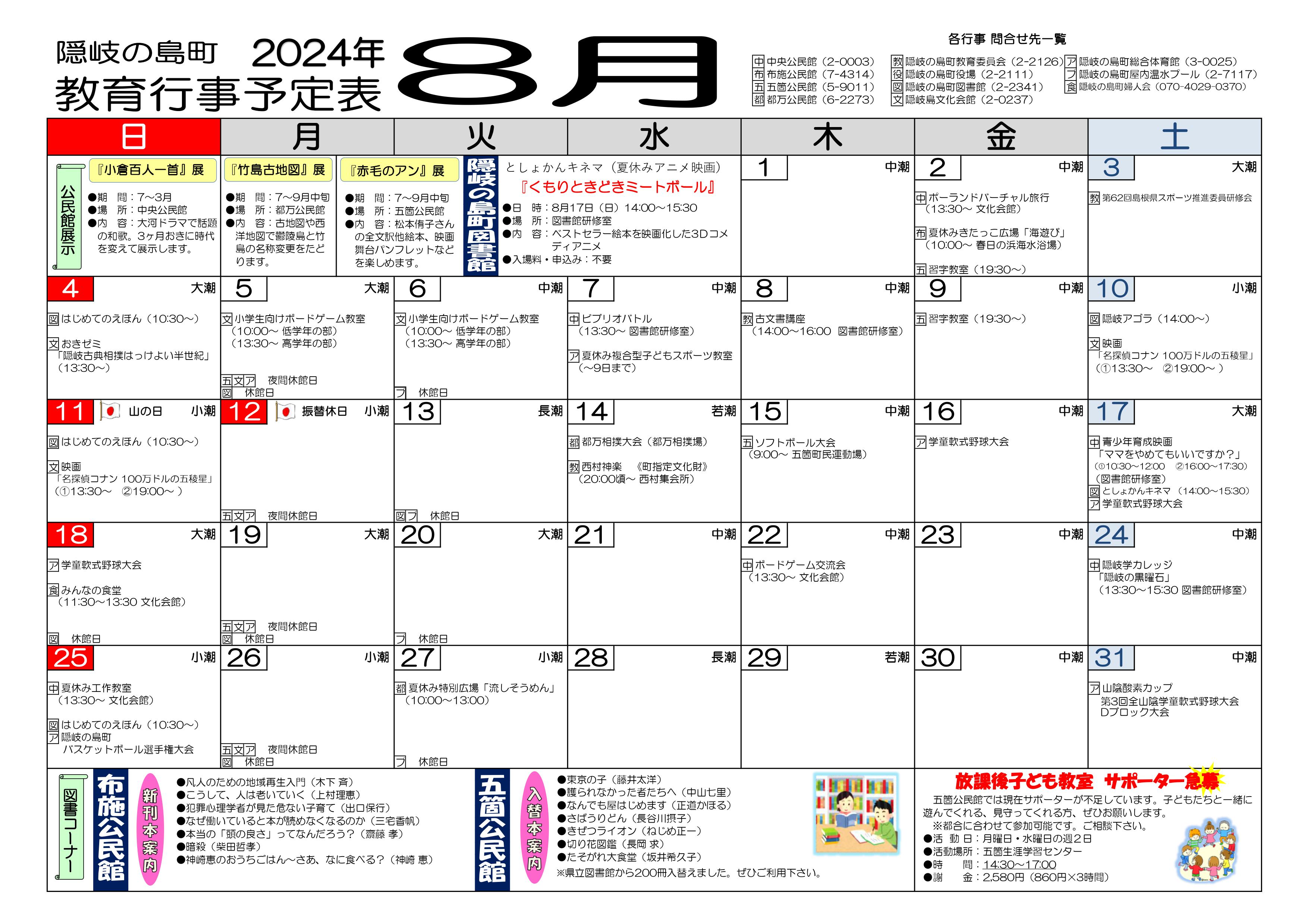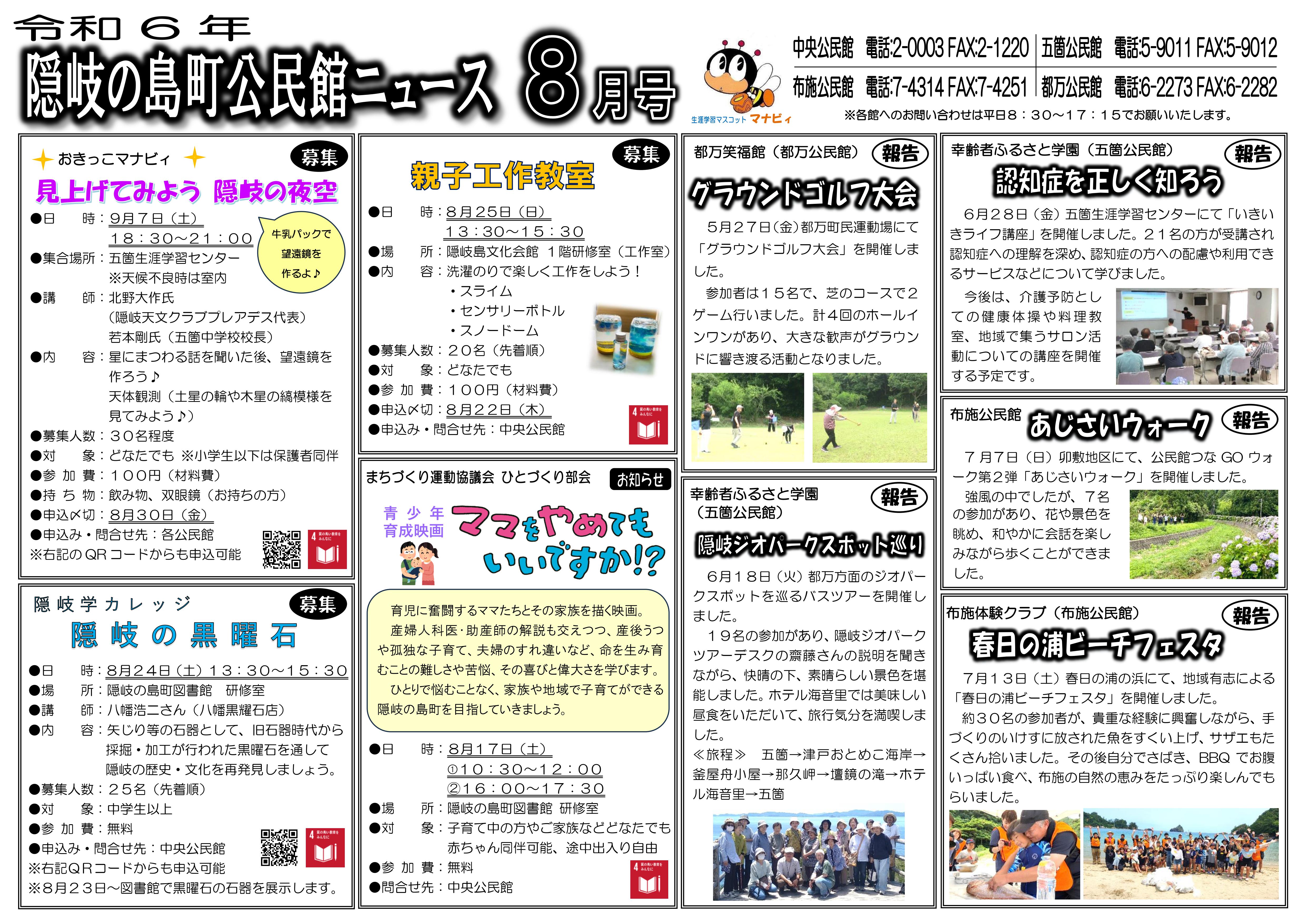 令和6年8月の公民館ニュースです。 PDF形式になっていますので、下記リンクよりダウンロードしてご覧ください。 ダウンロード 公民館ニュース2024年8月(記事面) (JPEG: 2.3MB) 公民館ニュース2024年8月(カレンダー) (JPEG: 954.6KB) この記事に関するお問い合わせ先 中央公民館〒685-0014島根県隠岐郡隠岐の島町西町吉田の二、2番地電話番号:08512-2-0003ファックス:08512-2-1220メールフォームによるお問い合わせ