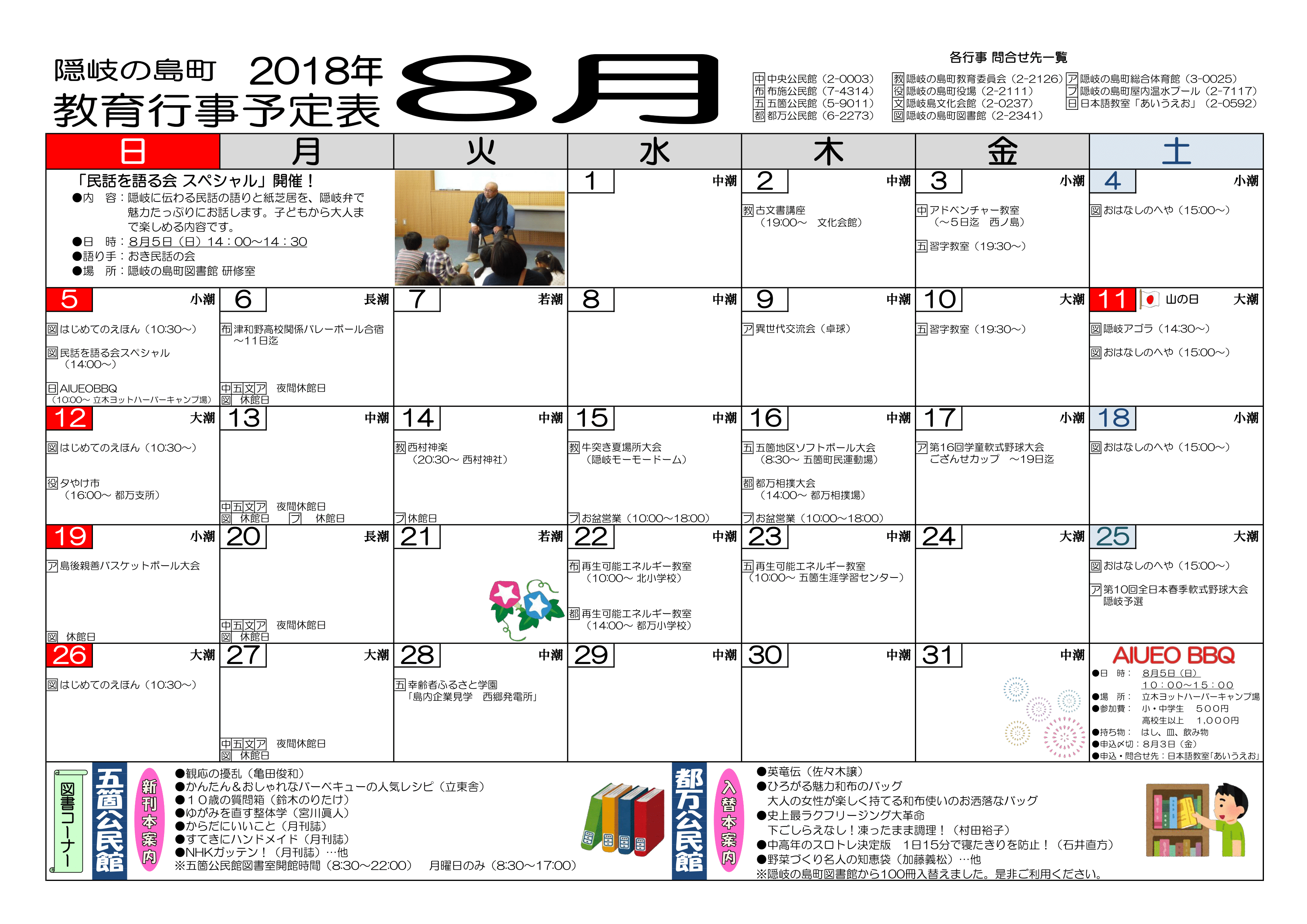 8月の公民館事業です。 PDF形式になっておりますので、下記リンクよりダウンロードしてご覧ください。 ダウンロード 公民館ニュース平成30年8月号(表面) (PNG: 1.4MB) 公民館ニュース平成30年8月号(裏面) (PNG: 646.4KB) この記事に関するお問い合わせ先 中央公民館〒685-0014島根県隠岐郡隠岐の島町西町吉田の二、2番地電話番号:08512-2-0003ファックス:08512-2-1220メールフォームによるお問い合わせ