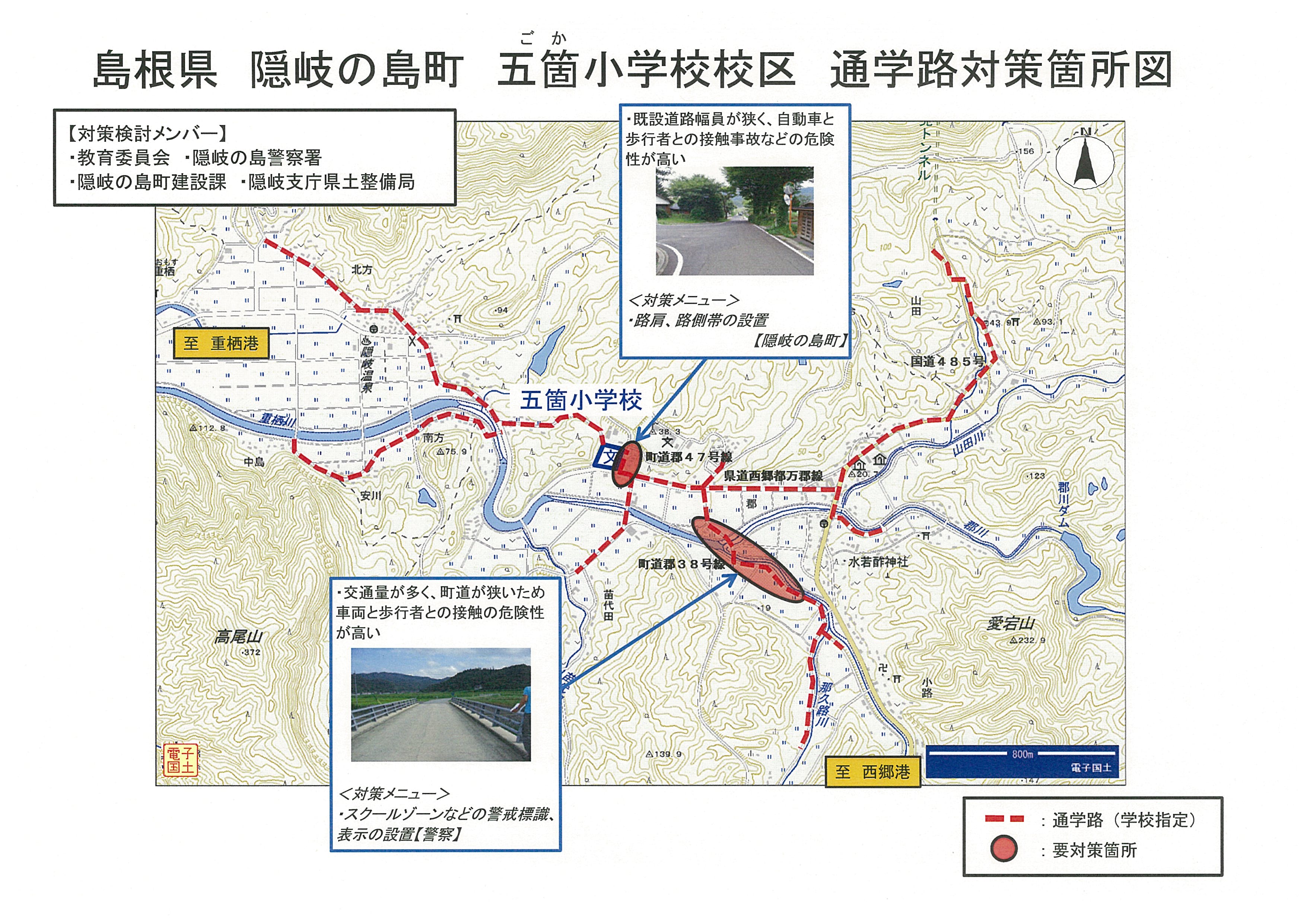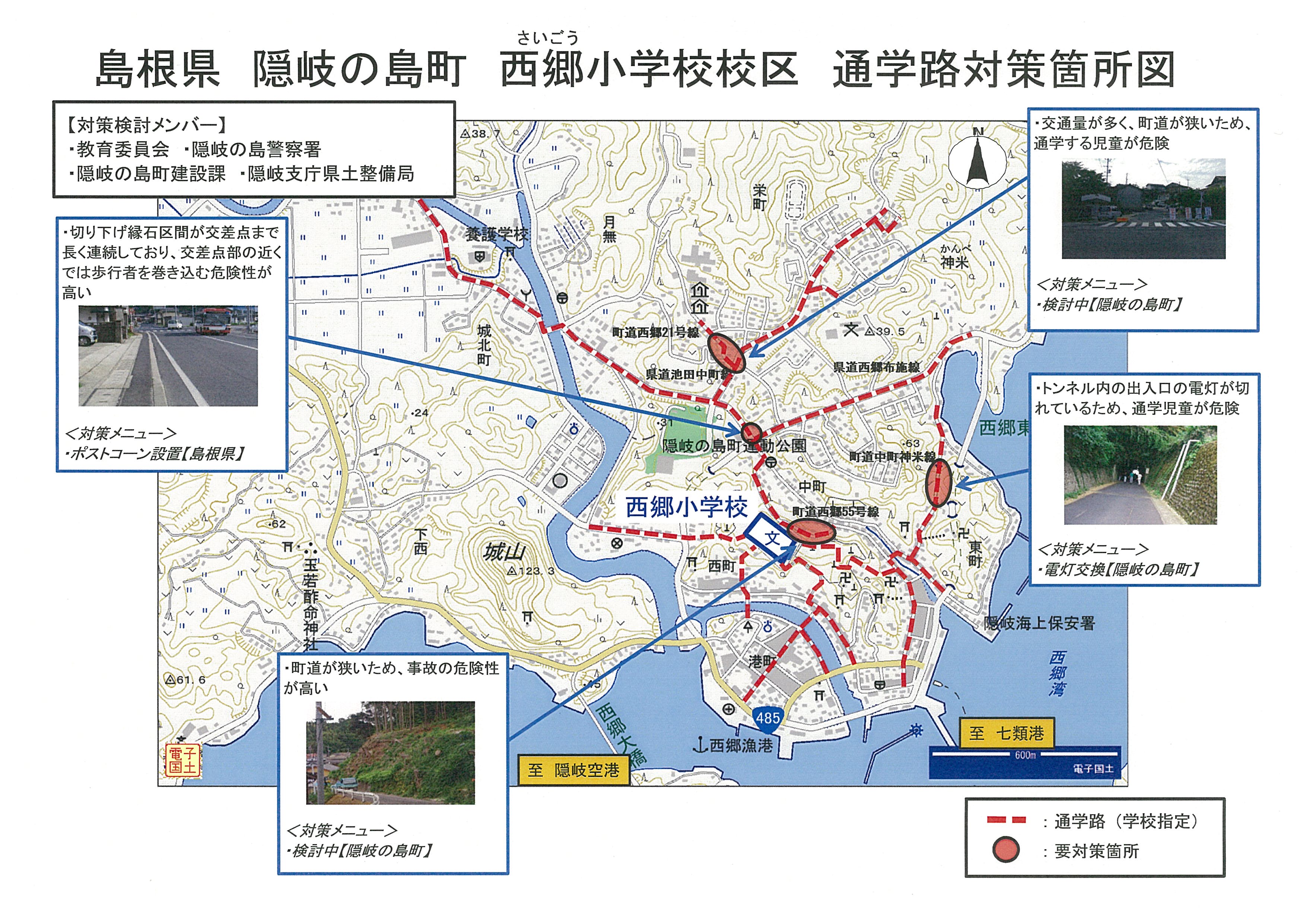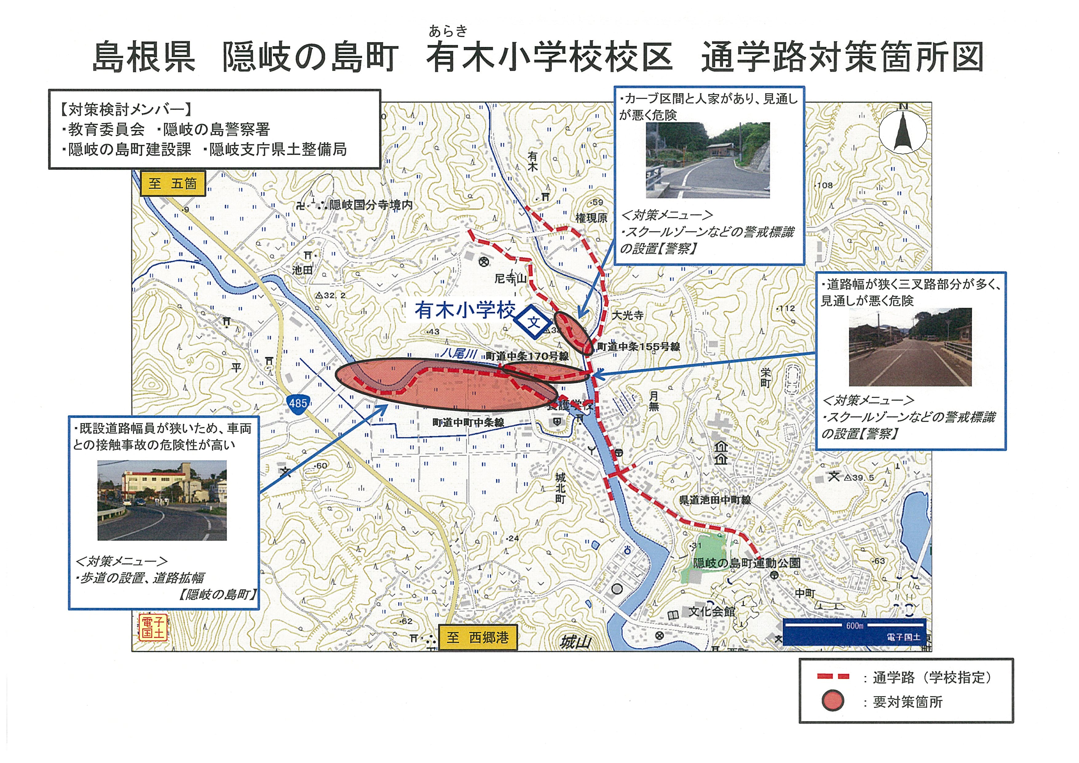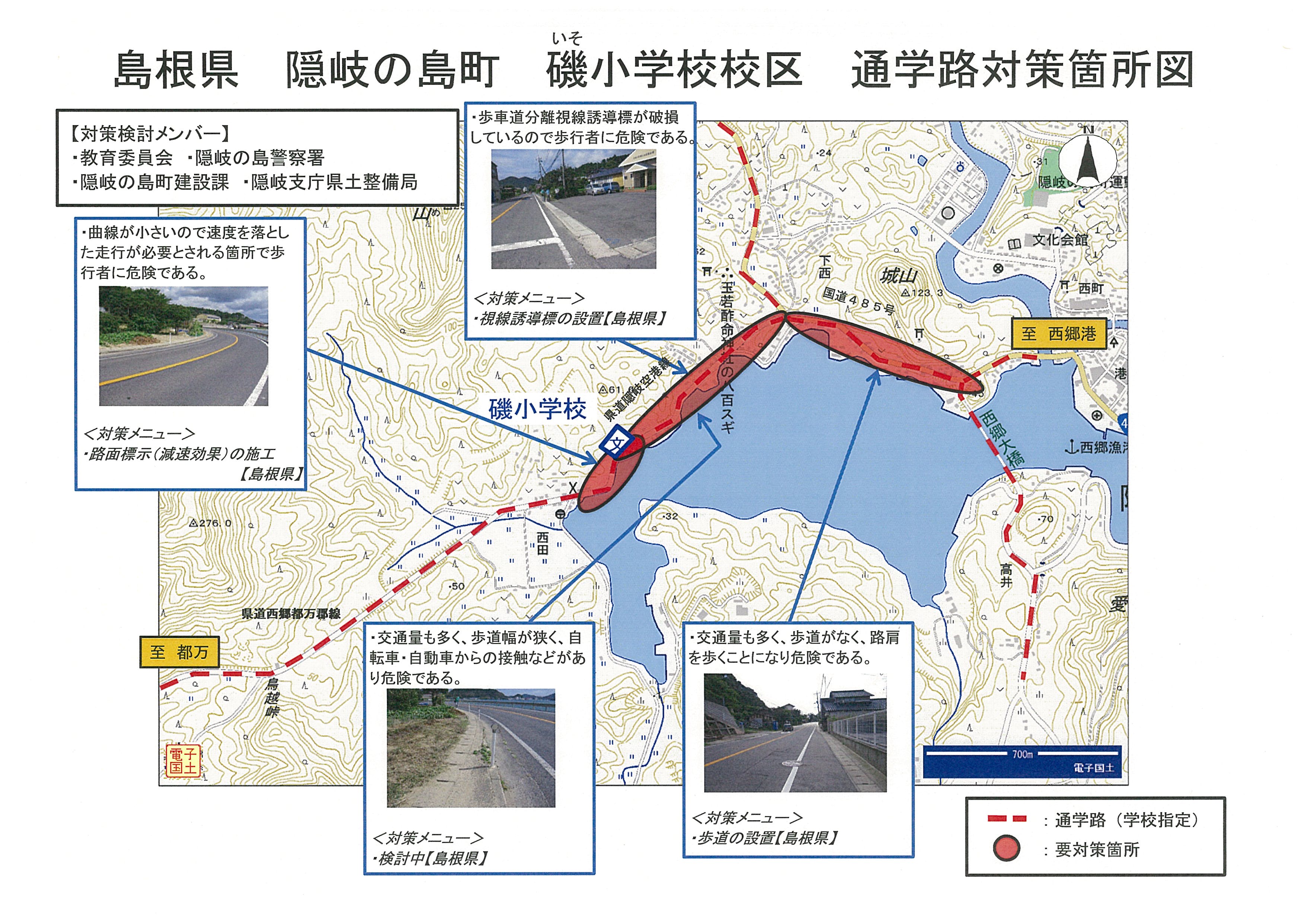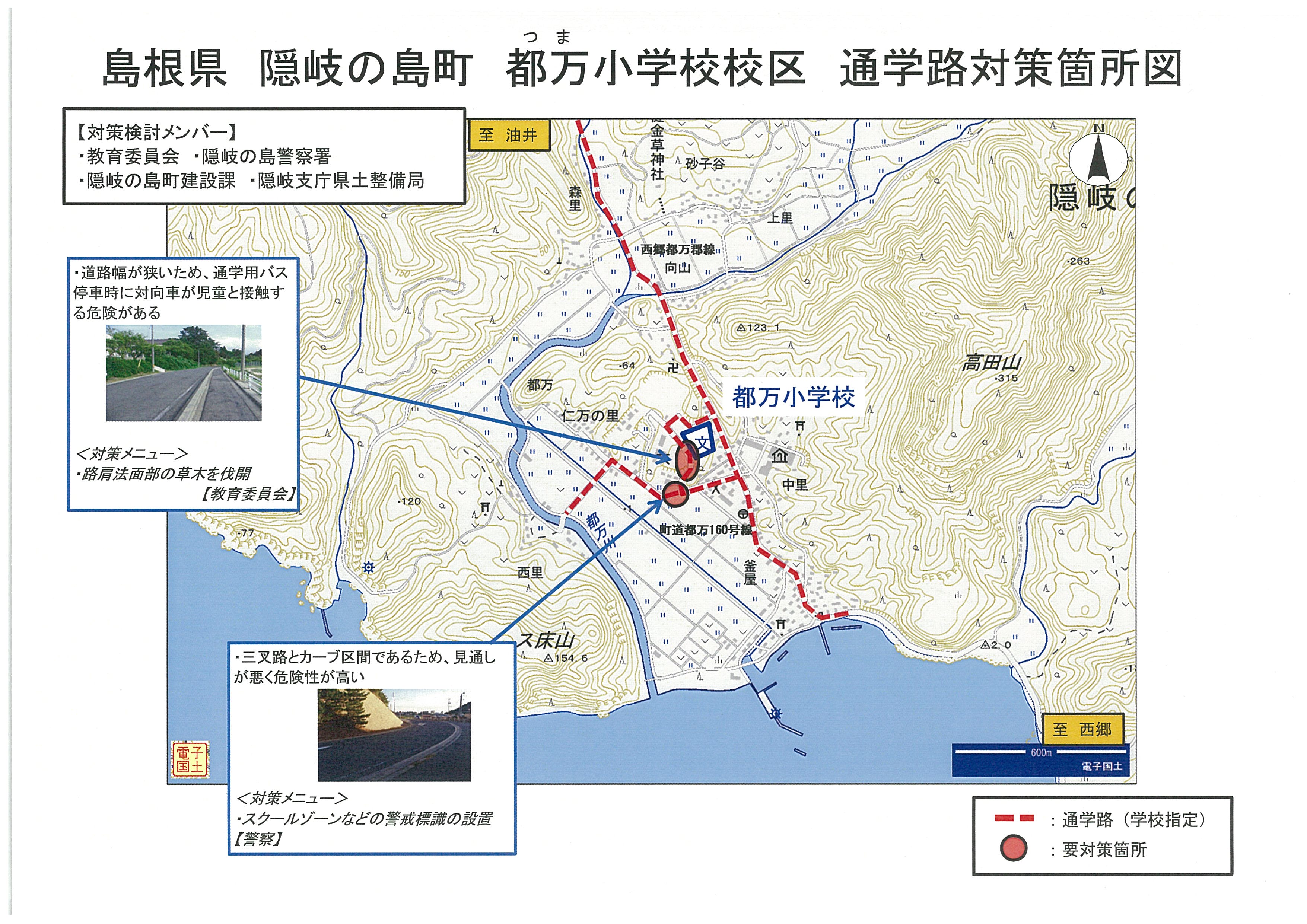 詳細につきましては、下記の「隠岐の島町内通学路の対策箇所一覧表」リンクをご確認いただくか、各小学校の名称のリンクからご確認ください。
