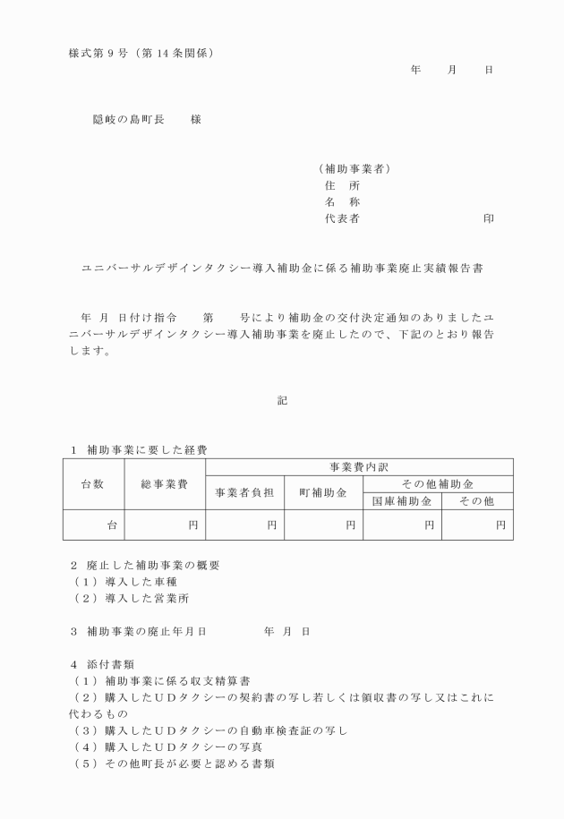 第12条 補助事業者は、補助事業を中止し、又は廃止しようとするときは、速やかにユニバーサルデザインタクシー導入補助金に係る補助事業中止(廃止)承認申請書(様式第6号)を町長に提出し、その承認を受けなければならない。