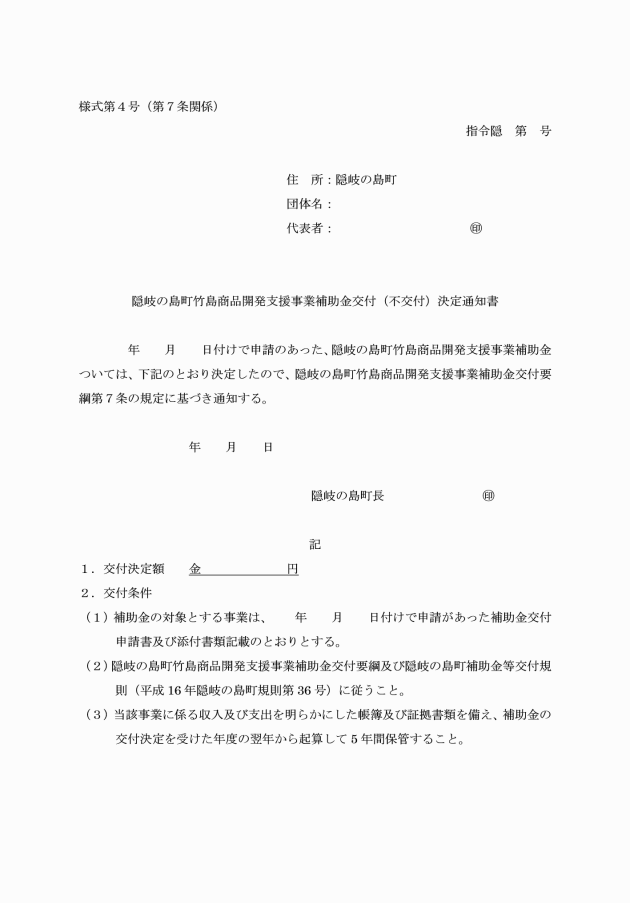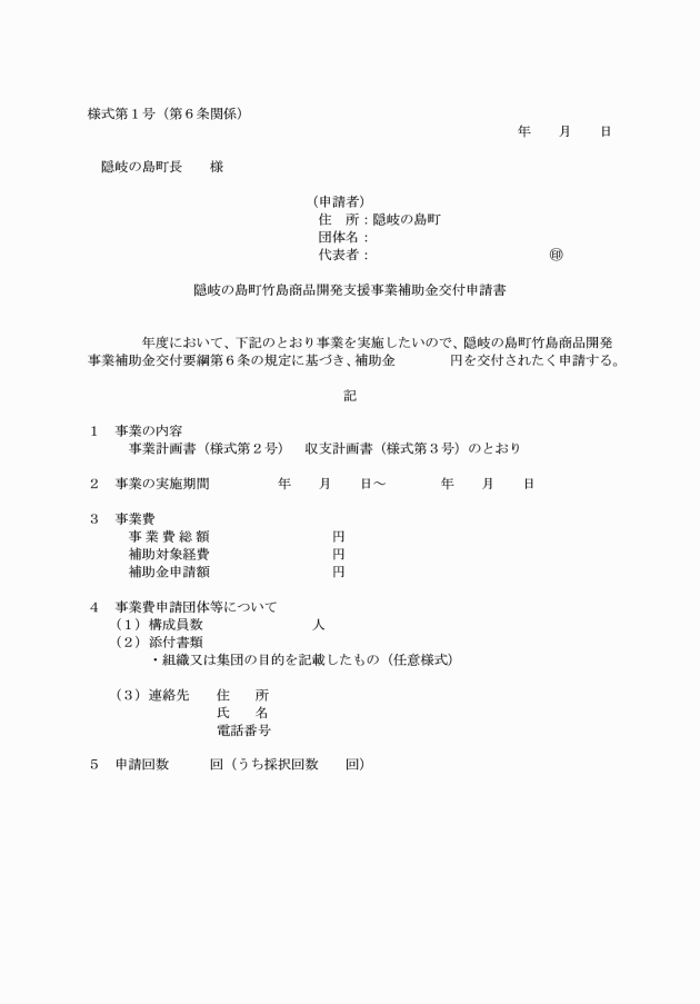第6条 補助金の交付を受けようとする者(以下「申請者」という。)は、隠岐の島町竹島商品開発支援事業補助金交付申請書(様式第1号)に次の書類を添えて町長に提出しなければならない。