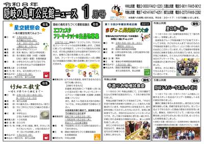 令和8年1月の公民館ニュースです。 PDF形式になっていますので、下記リンクよりダウンロードしてご覧ください。 ダウンロード 公民館ニュース2026年1月(記事面)(887KB)(PDF文書) 公民館ニュース2026年1月(カレンダー)(1109KB)(PDF文書) 公民館ニュース2026年1月(記事面)(887KB)(PDF文書) (PDFファイル: 887.7KB) 公民館ニュース2026年1月(カレンダー)(1109KB)(PDF文書) (PDFファイル: 1.1MB) この記事に関するお問い合わせ先 中央公民館〒685-0014島根県隠岐郡隠岐の島町西町吉田の二、2番地電話番号:08512-2-0003ファックス:08512-2-1220メールフォームによるお問い合わせ