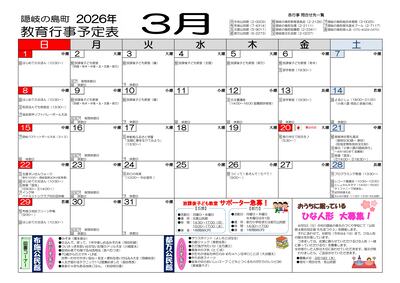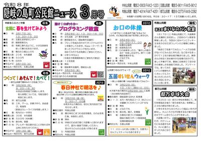 令和8年3月の公民館ニュースです。 PDF形式になっていますので、下記リンクよりダウンロードしてご覧ください。 ダウンロード 館報記事3月号(PDFファイル:469.6KB) 館報カレンダー3月号(PDFファイル:2.3MB) この記事に関するお問い合わせ先 中央公民館〒685-0014島根県隠岐郡隠岐の島町西町吉田の二、2番地電話番号:08512-2-0003ファックス:08512-2-1220メールフォームによるお問い合わせ