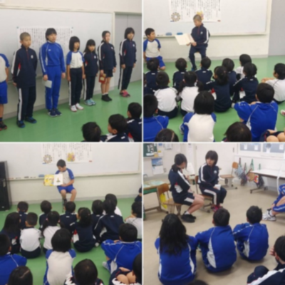 今朝の児童朝会は図書委員会さんの読み聞かせとクイズでした。楽しいお話に、笑いが漏れたり、クイズに楽しんで答えたりしていました。これから「図書王」という図書館、本に関するクイズも行う、という事でした。さて、「初代図書王」は誰になるでしょうか?