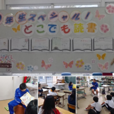 いよいよ卒業式間近になりました。先日は「どこでも読書6年生スペシャル」があり、私も初めて子どもの「どこでも読書」を見せてもらいました。「誰も来なかったら、どうしよう。」と心配していた6年生たち。でも、面白い選書をしてくれて、どこも楽しそうでしたよ。