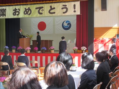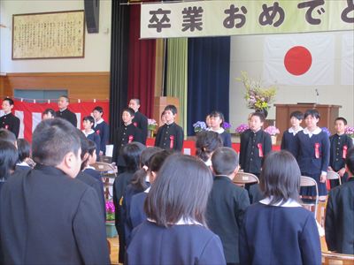 児童全員による「別れの言葉」では、よびかけの一言ひとことに思い出が重なり、在校生の目からも涙があふれました。式の最後には、5年生の伴奏に合わせ、校歌を歌いました。退場では、在校生の歌声が体育館に響きわたり、晴れ姿へのお祝いとこれからの中学校生活へのエールがこめられていました。そして大きな拍手の中、一人一人が立派に学舎を後にしました。
