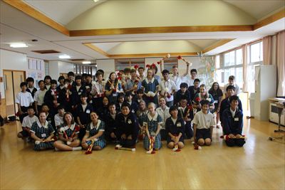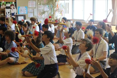 オーストラリアのマキロップ校の中高生20名が来校し、交流体験をしました。半日の交流でしたが「銭太鼓演技」をマキロップ校の生徒と共に練習し演技をし、給食も一緒に食べました。おもてなしの心が通じマキロップ校の生徒に喜んでもらうことができました。