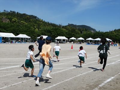 「二人三脚水入れリレー」や「玉入れ競争」の競技では、地区の方と一緒に競技に参加させていただきました。50・100m走では、多くの保護者の皆さんに児童と共に走っていただきました。