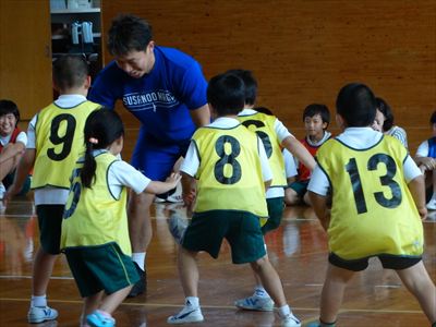 前半は、選手紹介・バスケットとの出会い(子どもの頃のお話)・プロ選手になるまでの苦労や努力などをお聞きしました。後半は、低学年・中学年・高学年チーム相手に試合をして頂きました。