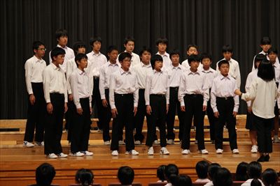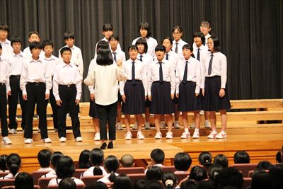 今年度も全校生徒で混声三部合唱の2曲「遥か」と「Fight」を披露しました。全校生徒33名と少数ですが、素晴らしい合唱をアリーナに響かせることができました。