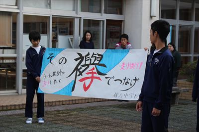 男子・女子の2チームが出場しました。選手は都万中の代表として最後まで襷をつなぎ、応援は選手のため『その襷でつなげ』という横断幕を作り声をあげ応援し、全校でチーム都万中として大会に臨み最後の対外行事を飾りました。