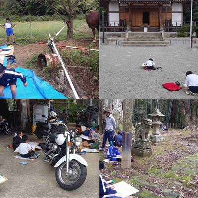 午前中3~6年生は、写生大会。松林さんの馬、坂本自転車店、住吉神社、国分寺の4ヵ所に分かれ、それぞれお気に入りの構図で、スケッチをしています。何とか天気も持ちそうです。どんな絵が出来上がるでしょうか。出来上がりが楽しみですね。