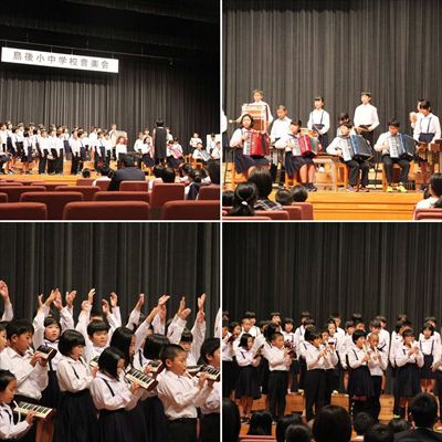 島後小中学校音楽会の様子です。一番でずい分緊張もしましたが、よくがんばったと思います。5.6年生の合奏もそれぞれ独立しての別々のパートの演奏だったそうです。「全校生」での合唱奏、見に来てくださった皆さんから「中条良かったよ。可愛かった。」と少しひいき目もあるかも知れませんが、お褒めの言葉もいただきました。子どもたちも満足そうでした。