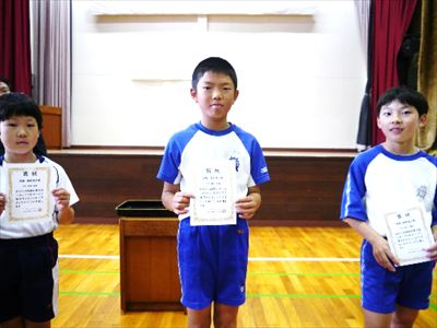 漢字大会4回連続満点賞の14人、計算大会4回連続満点賞の3人を表彰しました。漢字大会は努力をし続けた結果、計算大会は見直しもしっかりして間違いの無いようにした結果と誉めました。まだもう少しの高得点賞の人もたくさんいます。続けて欲しいし、もっとたくさんの人が賞をもらえるようにがんばって欲しいですね。