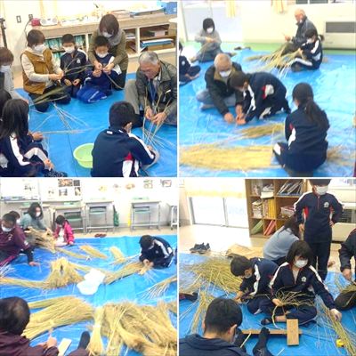 「しめ縄づくり」の様子です。一年生の学年閉鎖の中で開催の可否を迷いましたが、元町長の松田さんも飛び入りで講師さんを務めていただくなどして、賑やかに恒例の行事も行わせてもらいました。たくさんお越しいただいてありがとうございました。教えられながらも、毎年このような体験をすることで経験となって残って行くのだと、高学年になるほど次第に上手になる子ども作のしめ縄をみながら感じました。実は松田さんも中学生の頃作ったしめ縄を誉められた経験が今のしめ縄づくりに繋がっているそうですよ。