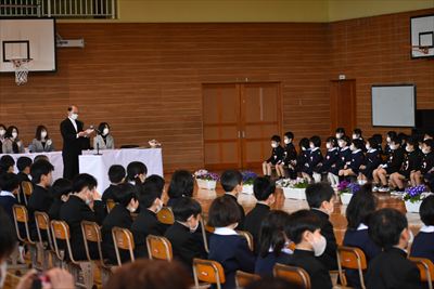 新型コロナウイルスの感染拡大により開催が心配されましたが、人数を制限するなどの工夫をして、無事に64名の新入生を迎える入学式を行うことができました。「やさしく かしこく たくましく」という教育目標のもと、教職員が一丸となって努力していくことを確認しました。新たな仲間を迎え、2~6年生もたくさんの笑顔が見られた1日となりました。