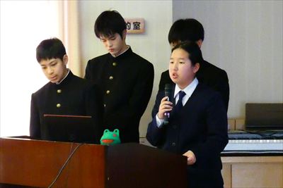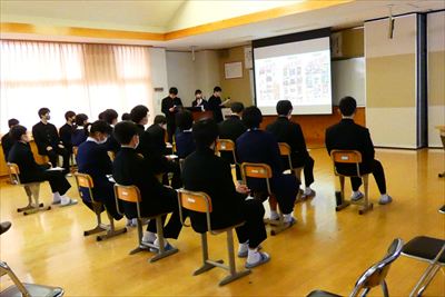 今年度は、中学生議会が中止になったため、都万中単独で中学生議会を行いました。3年生がグループに分かれ隠岐の島町をより良くするアイディアを考え、1・2年生に向けて提言をしました。当日は池田町長様をはじめ事前学習でお世話になった町役場各課長様や担当者の方々も来場くださり、心強いメッセージを伝えてくださいました。おかげで3年生はふるさとへの愛着が深められ、みなが達成感を味わうことができました。
