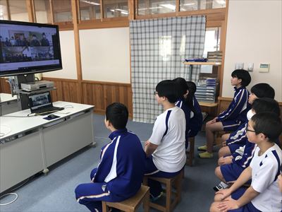1月29日、磯小、有木小、北小、中条小4校の6年生がリモート交流をしました。今年度は新型コロナウイルス感染拡大防止のため、各学校の教室からパソコンを通じて交流しました。6年生は自己紹介をしたり、特技を披露したり、工夫しながら発表していました。
