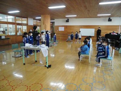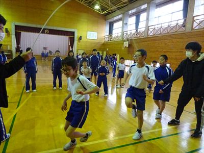 2月19日、全校でなわとび大会を行いました。低・中・高学年に分かれて、前跳び・後跳びを何分間跳び続けられるか競いました。また、色別ごとに8の字跳びをし、班ごとに応援する声やカウントする声が体育館に響いていました。1年生から6年生までお互いに助け合いながら跳んでいる姿が印象的でした。