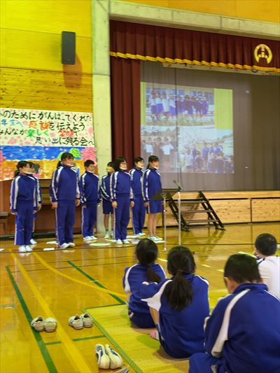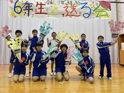 .3月3日、6年生を送る会が行われました。これまで磯小を引っ張ってきた6年生に感謝の気持ちを伝えるために、各学年堂々と発表をしていました。特に5年生は計画から本番まで在校生の中心となって送る会を作り上げました。6年生は発表を見て泣いたり笑ったりとても喜んでいました。5年生お疲れさまでした。