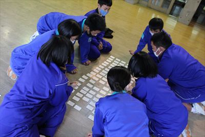 全校で百人一首大会を行い、新型コロナウイルス感染症対策を行ったうえで他学年との交流をすることができました。全校10チームに分かれ真剣勝負が繰り広げられました。