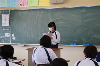 7月15日に校内弁論大会を開催しました。学級弁論を行い、各学級より2名程度の代表を選出し、行いました。今年は様々なテーマの弁論発表があり、中学生らしい鋭い視点と今後の生き方を真剣に考えている様子がうかがえました。9月7日の全隠岐中学校弁論大会には校内で選出された2名の弁士が出場します。