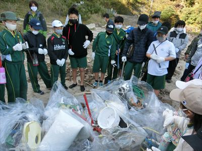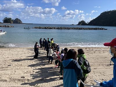 11月3日に大山隠岐国立公園隠岐管理事務所主催の「子どもの農山漁村プロジェクト体験事業」が布施の春日の浜を中心に行われ、学校行事として全校で参加しました。水産高校の海洋クラブの高校生たちも参加してくれました。春日の浦でビーチクリーン活動を、春日の浜に移動して地引網体験を行いました。最後に布施地区でとれる山の幸海の幸を食材として調理していただいたものを昼食としていただきました。この体験事業には、布施公民館、ジオリゾートシンフォニーの松山様はじめ、布施地区の方々総勢70名が関わってくださいました。