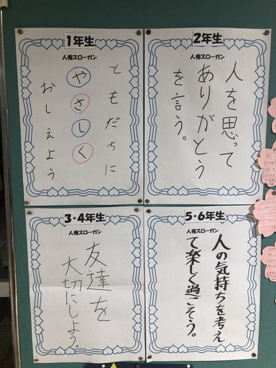 本校では12月3日から10日までを人権週間として、学級で人権スローガンを作り、人権週間の期間中毎日、一人一人、振り返りを行いました。全員が、「心のやさしい子」につながるコメントを書きました。本校の目指す、「きたのこ」に子どもたちが近づけたようで、良い機会となりました。これからも、学校で「人権」について学んでいきます。