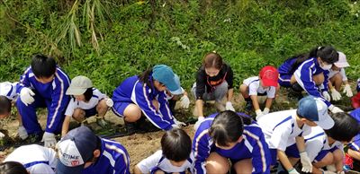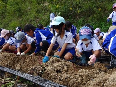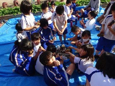 春に子どもたちが縦割り班で植えたサツマイモが大きく育ち、この日、いもほりを行いました。大きないもに歓声をあげながら楽しそうに掘っていました。最後に各色の班ごとにおもしろい形のサツマイモを発表し、収穫を楽しみました。