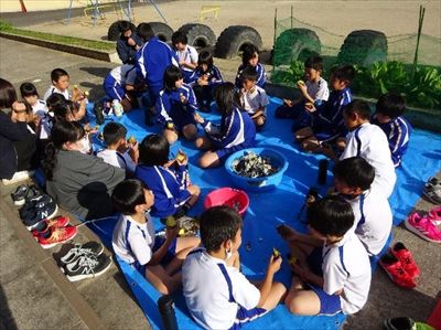 10月14日に堀ったいもをみんなで食べました。自分たちで育てたものを自分で食べることで食べ物に対する感謝の気持ちや育てることの喜びを感じることを目的として実施しました。焼いたいもはテラスで輪になって、みんなでほかほかの焼きいもを食べました。秋晴れの中、全校が輪になり、口いっぱいに秋の味覚を楽しみました。