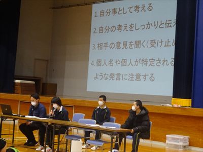 12月17日(金)に人権集会がありました。今回の人権集会では、自分たちの学校生活を人権尊重の視点から振り返りました。事前に人権に関するアンケート調査を行い、その結果から課題を設定し、その解決策を話し合いました。寒い中での集会となりましたが、人の優しさや思いやりの心に触れることができる、心温まる人権集会になったと思います。
