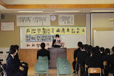 1月11日、今年の一言発表会が実施されました。全校生徒が、今年頑張ることや意識すること等、今年にかける思いを発表しました。全校の前で発表することで、それぞれの思いが一層強くなりました。
