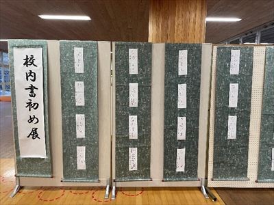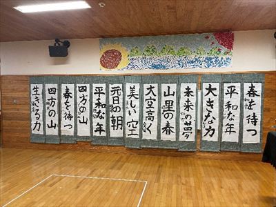 子どもたちが冬休みに書いてきた作品をホールに掲示しました。子どもたちが丁寧な字で1文字1文字心を込めて書いたことがよく分かります。子どもたちは休み時間に作品を眺めていました。
