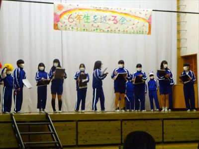 3月2日、6年生をおくる会が行われました。「6年生に感謝の気持ちを伝え、みんなが楽しく、笑顔で送れる会にしよう」をテーマに、5年生を中心に話し合い、準備をしてきました。当日は、各学年が工夫を凝らした出し物をして盛り上がりました。6年生も在校生へのメッセージを伝えました。全校の子どもたちにとって大切な思い出に残る、心温まる会になりました。