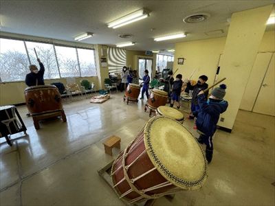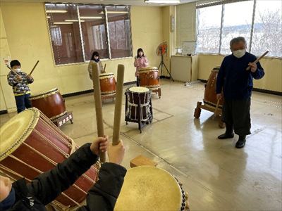 3年生は総合的な学習の時間に「磯地区の名人に教わろう」という学習をしています。磯地区で活躍されている名人に話を聞いたり、体験をさせてもらったりして児童の豊かな学びに繋げています。2月16日は、今津地区に住む隠岐太鼓の名人に教わりに行きました。子どもたちは熱心に話を聞き、隠岐太鼓を実際に叩かせてもらい、和太鼓の響きを体感しました。