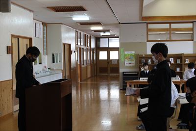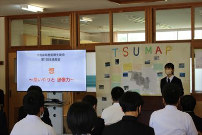 4月27日、生徒総会を行いました。生徒会のスローガンは「想~思いやりと想像力~」。総会では活発な意見交換が行われました。