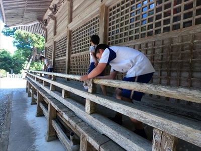 御霊会風流が近づく5月31日、4~6年生42名で玉若酢命神社の清掃を行いました。拝殿の床や階段、本殿の扉、石の柵の表面など、繰り返しこするように拭き、汚れた雑巾を何度も何度も洗って掃除をしました。真っ白な雑巾が真っ黒になるまで、最後まで途切れることなく掃除に励む子どもたちの姿が見られました