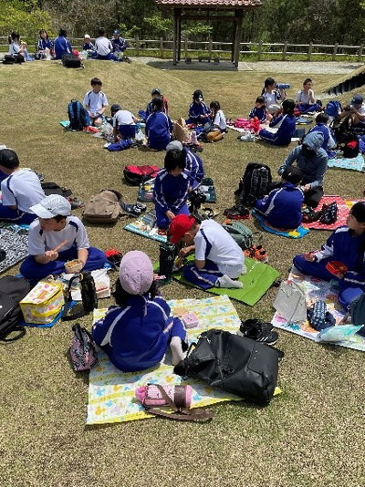 5月2日、春の遠足がありました。全校たて割り班で、リーダーである6年生が中心となり、励まし合って歩いたり、目的地の寺の前公園で一緒に遊んだりしました。
