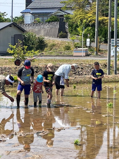 5年生と年長さんとペアを作り、一緒に田んぼに入り、上級生として、年長さんのお助けをしながら苗を植えていきました。