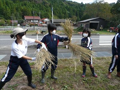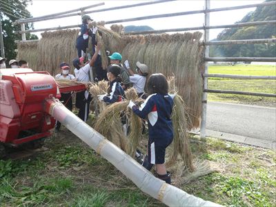 5・6年生は、田植えに引き続き地元農家の若林さんにお世話になり、稲刈りと脱穀の体験を行いました。稲刈りでは、刈り方を教わるとコツをつかみ、順調に刈り進めることができました。稲の束をしっかり締めることが難しかったですが、互いに教えあいながら作業を進め、最後に最近では珍しくなった「はで場」に干す体験をさせていただきました。また、脱穀では、干した稲をはでから降ろしたり、機械に入れたり、出てきたわらを運んだりとみんなで協力しながら楽しく作業を行い、田植えの時と同様に、とても上手にできたと褒めていただきました。
