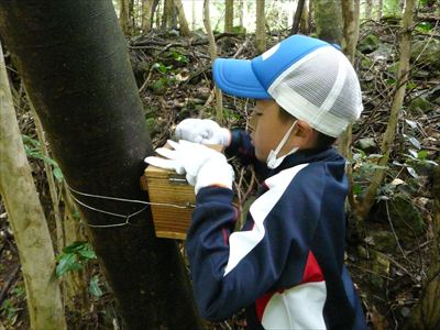 隠岐世界ジオパークツアーデスクの方をはじめ地域の方々のお世話になり、ヤマネの森へ出かけました。7月に新たに設置した巣箱にヤマネがいるかもしれないとワクワクしながら調査をしました。残念ながらヤマネと出会うことはできませんでしたが、巣箱の中に動物が食べた木の実やクモなどの動物が入っている様子を観察できました。また、樹上に設置した赤外線カメラの映像を確認したところ、ヤマネが枝上を素早く移動している様子が撮影されており、「確かにヤマネはいるんだ」ということが分かって子ども達は大喜びでした。他には天然記念物のカラスバトなどの鳥類やヒメネズミ、イタチなどが写っていました。同定できなかった鳥類は専門家に分析を依頼していただき、多くの鳥類がいることも分かりました。