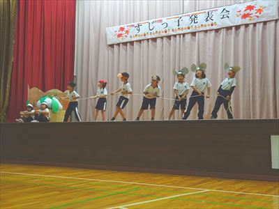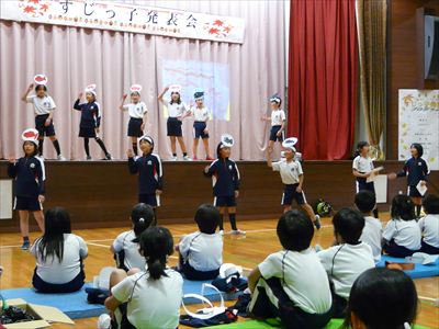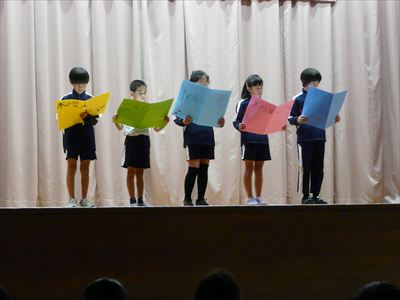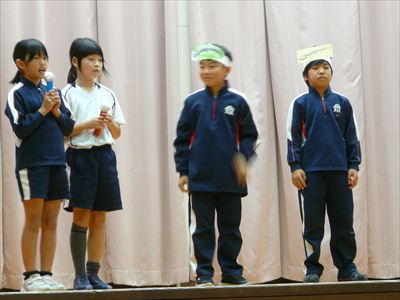 今まで学習してきたことを保護者・地域の方にどう伝えるか、歌やダンス、クイズ、劇仕立てなど学年ごとに工夫を行い、今年度の学習の成果を発表しました。1年生は「おおきなかぶ」をリズムよく元気いっぱい発表しました。2年生は「スイミー」をきれいな歌声を交えて登場人物になりきり発表しました。3年生は、隠岐の固有種について調べ、調査した結果をクイズを交えて発表しました。4年生は方言について地元の方へ取材して学んだことを明るく笑いを交えて発表し、会場を盛り上げました。5・6年生は、天然記念物「ヤマネ」について巣箱調査を通して学んだことをニュース番組風に伝えました。当日は、分かりやすく堂々と体全体を使って表現しようとする姿に成長を感じました。たくさんの保護者・地域の方にご来校いただき、温かい拍手をいただきました。