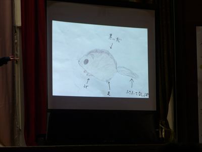 「かなぎ漁」とは漁師が小舟を操り、底にガラスを貼った「箱めがね」で海底を覗きながら、サザエやアワビ、ワカメなどをヤスで突いて捕る、明治時代から続く伝統漁法です。今回、隠岐水産高校の3年生15名が来校し、5・6年生が教えてもらいました。クイズを交えながらの説明や、高校生が自作したヤスを使って実際にサザエの殻等を突いて捕るゲームを行いました。高校生と学習を行うことは初めてなので緊張した面持ちでしたが、次第に緊張も解け、かなぎ漁について楽しく学習することができました。