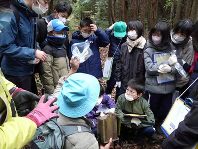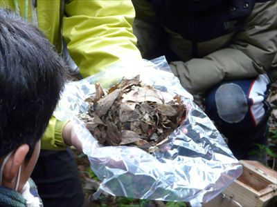 12月5日(月)に、5・6年生がヤマネ博士である湊先生、饗場さん達と一緒に、今年度最後となる巣箱調査へ出かけました。調査では、ヤマネのものと思われる巣箱が見つかり、みんな大興奮! 子ども達が素手で巣材を取り出し、湊先生がそっと巣を開けてみると・・・残念ながらヤマネはいませんでしたが小さな黒い塊が多数。「これはヤマネのフンの可能性が高いですね。」という湊先生の言葉に、子ども達は大喜びでした。また、落ち葉が沢山入ったヒメネズミの巣材を発見。中に生き物がいないか確認し、巣箱の中から慎重に取り出すと、初めて見るたくさんの落ち葉でできたボール状の巣がありました。この不思議な丸い巣材を持ち帰って調べると、落ち葉の大きさが巣の外側と内側とでは大きく違うことや、300枚を超える葉で作られていることなどが分かりました。