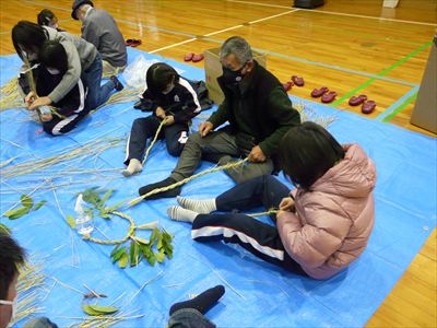 毎年恒例の子ども達も楽しみにしている本事業。各地区から例年より多くの指導者の方々にお越しいただき、お持ちの技を丁寧に教えていただきながら、全員がしめ飾りを完成させることができました。初めての試みとして、今年は5・6年生が事前に「藁すぐり」を体験し、藁の準備をしました。子ども達は繰り返し経験することで、学年が上がるにしたがって飾りづくりが上手になっているのがよく分かります。この体験は、失われつつある伝統文化に子ども達がふれるとても貴重な機会であることを改めて実感しました。親子のふれあいのみならず、地域の方との交流もでき、賑やかな会になりました。