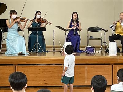 9月22日にサロンオーケストラジャパンの皆様をお招きし、演奏・体験授業を行いました。小規模演奏でありながらも迫力のある生のプロの演奏に全校児童・教職員ともに引き込まれました。後半は指揮者体験やバイオリンの試奏等、贅沢な体験もすることができました。