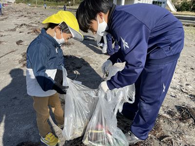 保育所、小学校、中学校が縦割りで10班に分かれ塩の浜の清掃活動に取り組みました。異年代での交流を深めるとともに、それぞれの場所を丁寧に掃除することができました。