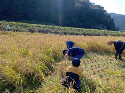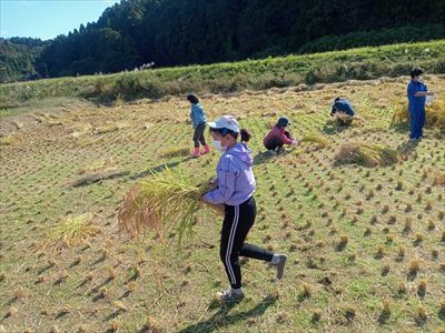 3・4人一組でチームを組み、稲を刈る人と縛る人に分かれて行いました。なかなか難しい作業でしたが、地域の稲刈り名人の方に教えてもらいながら一生懸命頑張りました。子供たちの中には、「私縛るのが得意だから任せて」と意欲的にがんばる姿が見られました。また、落ちている穂を拾って集めるなど、自分で考えて行動する姿も見られました。