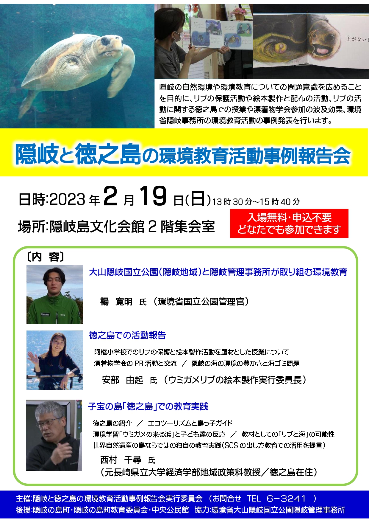 この報告会は、隠岐の自然環境や環境教育についての問題意識を広めることを目的に、ウミガメ「リブ」の保護活動や絵本製作と配布の活動、リブの活動に関する徳之島での授業や漂着物学会参加の波及効果、環境省隠岐事務所の環境教育活動の事例発表を行います。