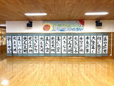 本校では今年度も、大槻咲子先生を講師に招き、書き初めの指導をしました。一人一人の頑張りを認め合う機会として、校内書き初め展を実施しました。